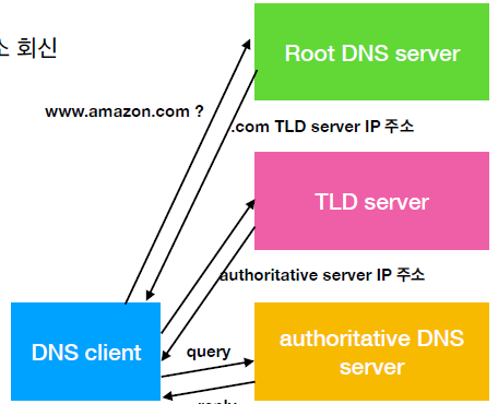 - top-level domain DNS server (TLD): com, org, uk, fr 등을 다룬다. (amazon.com는 어느 authoritative DNS server에 있는 지 알려준다.)