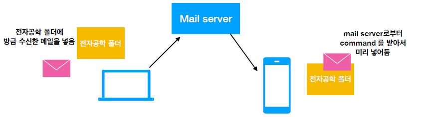 IMAP: 내 핸드폰에 있는 프로그램이 mail server의 내용을 가지고 있다. 인터넷이 안되도 메일을 읽을 수 있다.