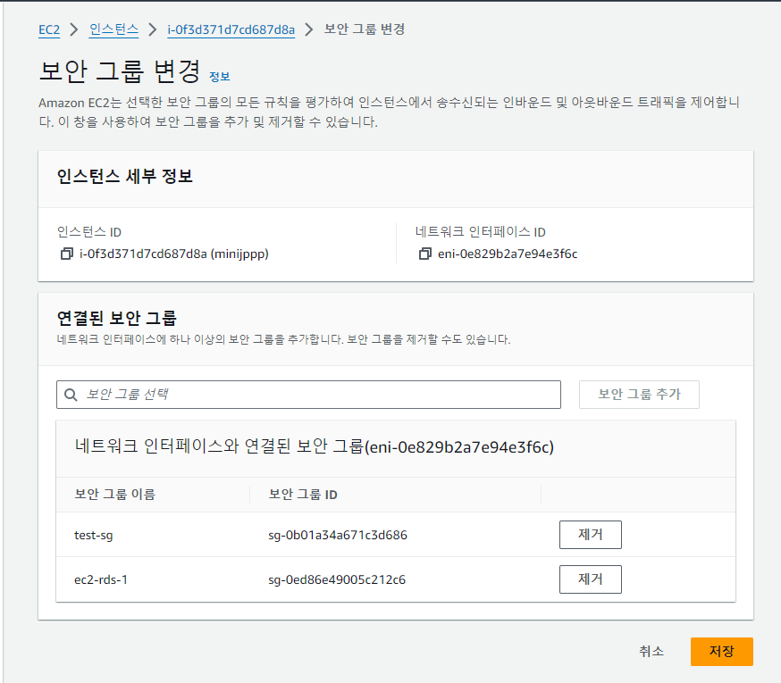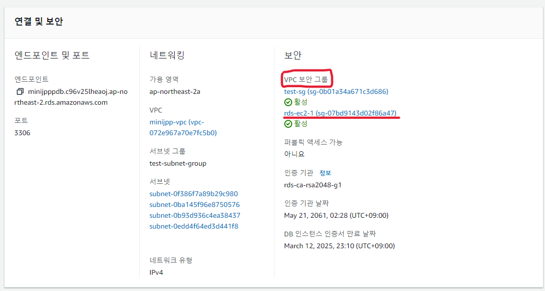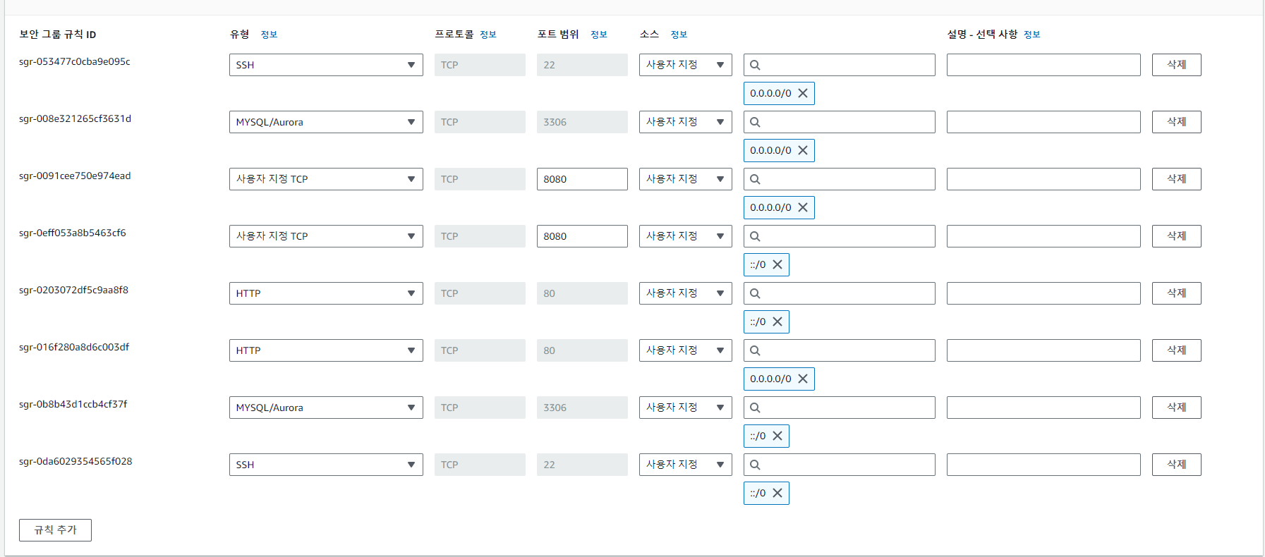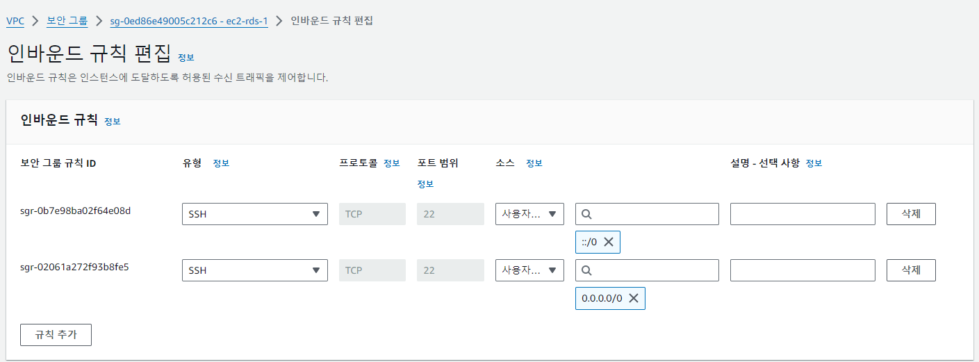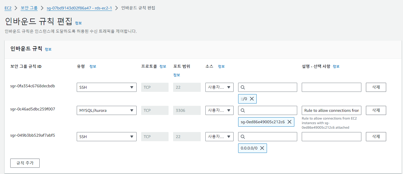 22포트는 외부에서 VPC에 있는 나의 EC2에 접근하도록 규칙을 설정한 것이고 3306 포트는 VPC 내부에서 EC2를 통해 RDS에 접근할 수 있도록 설정한 것이다. (3306포트에 적용된 소스를 보면 EC2 보안 규칙에 적용된 VPC 보안 그룹의 id이다. 즉 해당 보안그룹을 거쳐 들어온 트래픽만 3306 포트를 통해 받아주겠다는 말)