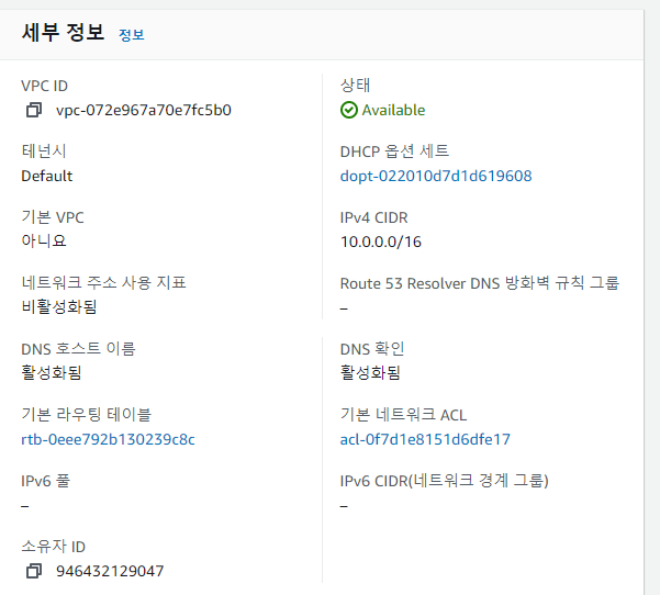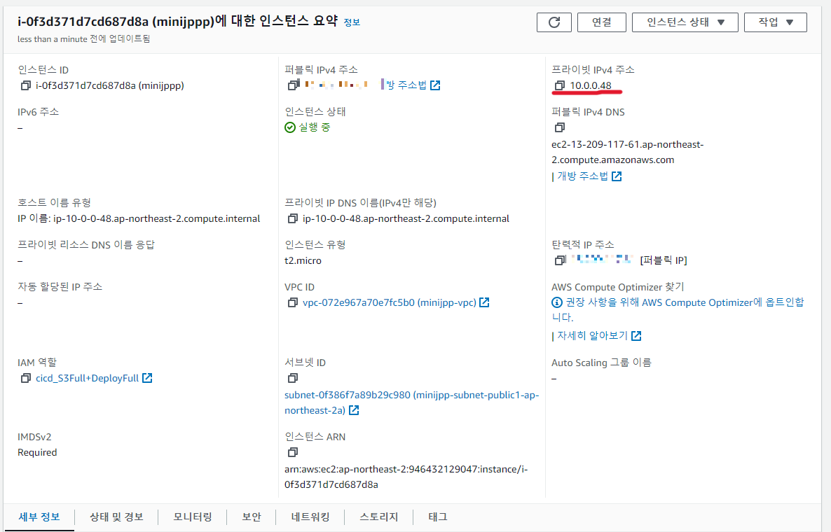 내 EC2의 private IP를 보면 VPC에서 지정한 CIDR 내에서 할당된걸 볼 수있다.